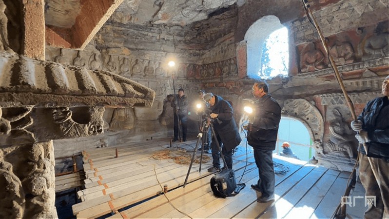 文保人員在洞窟里對造像進行拍攝存檔(央廣網(wǎng)記者 張晉鵬 攝)